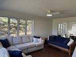 First floor features a living room, kitchen, and dining room that seats 10 (table expands to seat 14). There is also a full bath and bedroom with a queen bed on floor one. Upstairs has 4 large bedrooms (BR2 has a king, BR3 has a king, BR4 has 2 twins, and BR5 has a queen with a balcony!). There is also a second-floor full bathroom, and the large deck boasts distant ocean views and views of the Rachel Carson preserve. Amenities include TV with YouTube TV and a ROKU device, dishwasher, microwave, washer/dryer, AC units in all bedrooms, ceiling fans, WIFI, gas grille, and an outdoor patio set on deck. There is driveway parking for 4 cars.